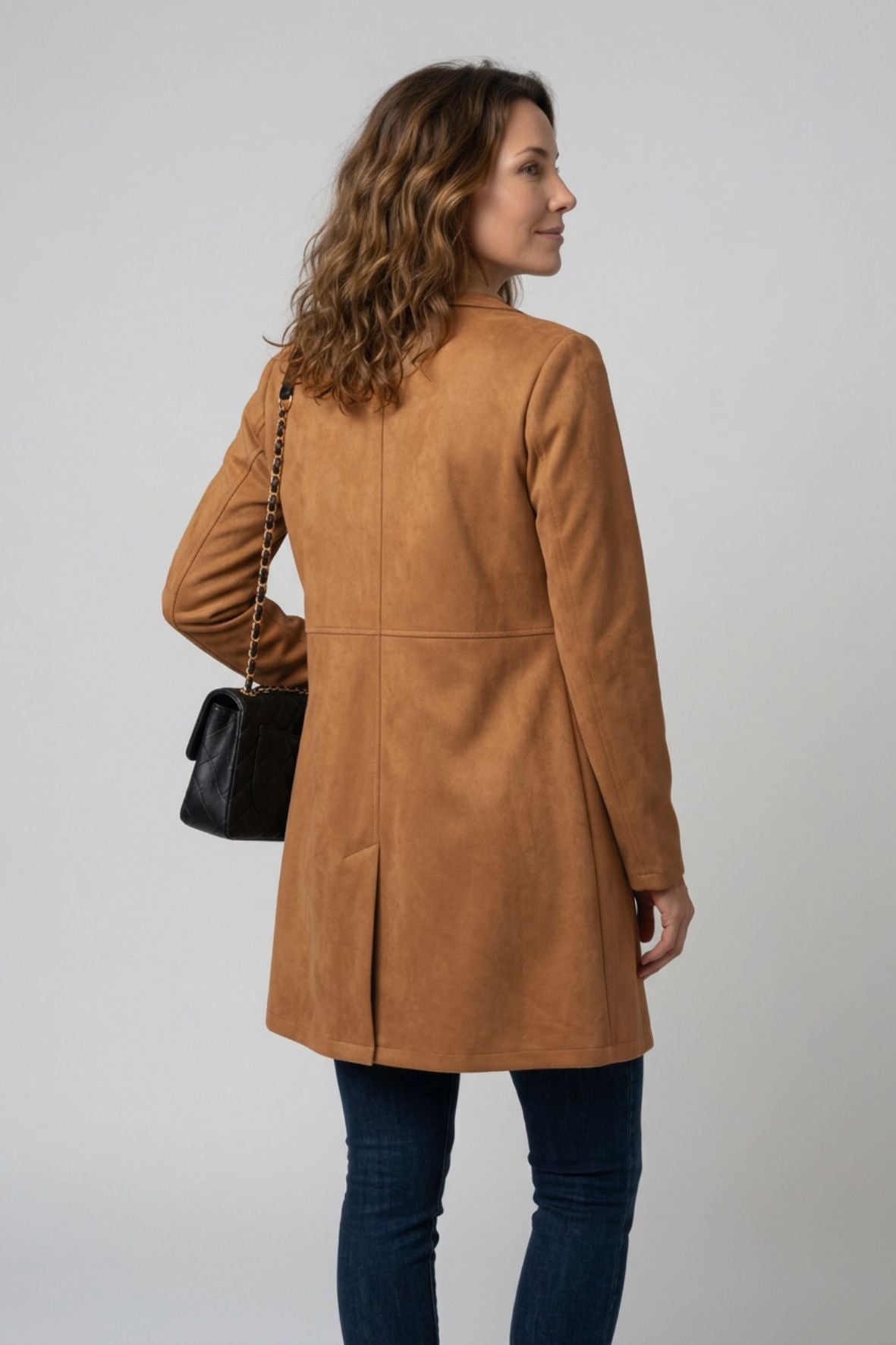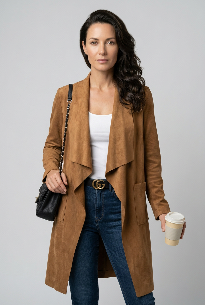 Abrigo Madeleine en gamuza suave con caída elegante y fluida. Diseño delgado y versátil que se adapta a cualquier silueta, perfecto para capas. Cuenta con bolsillos funcionales y largo hasta media pierna, ideal para transiciones de estación. Una pieza esencial que combina comodidad y sofisticación.