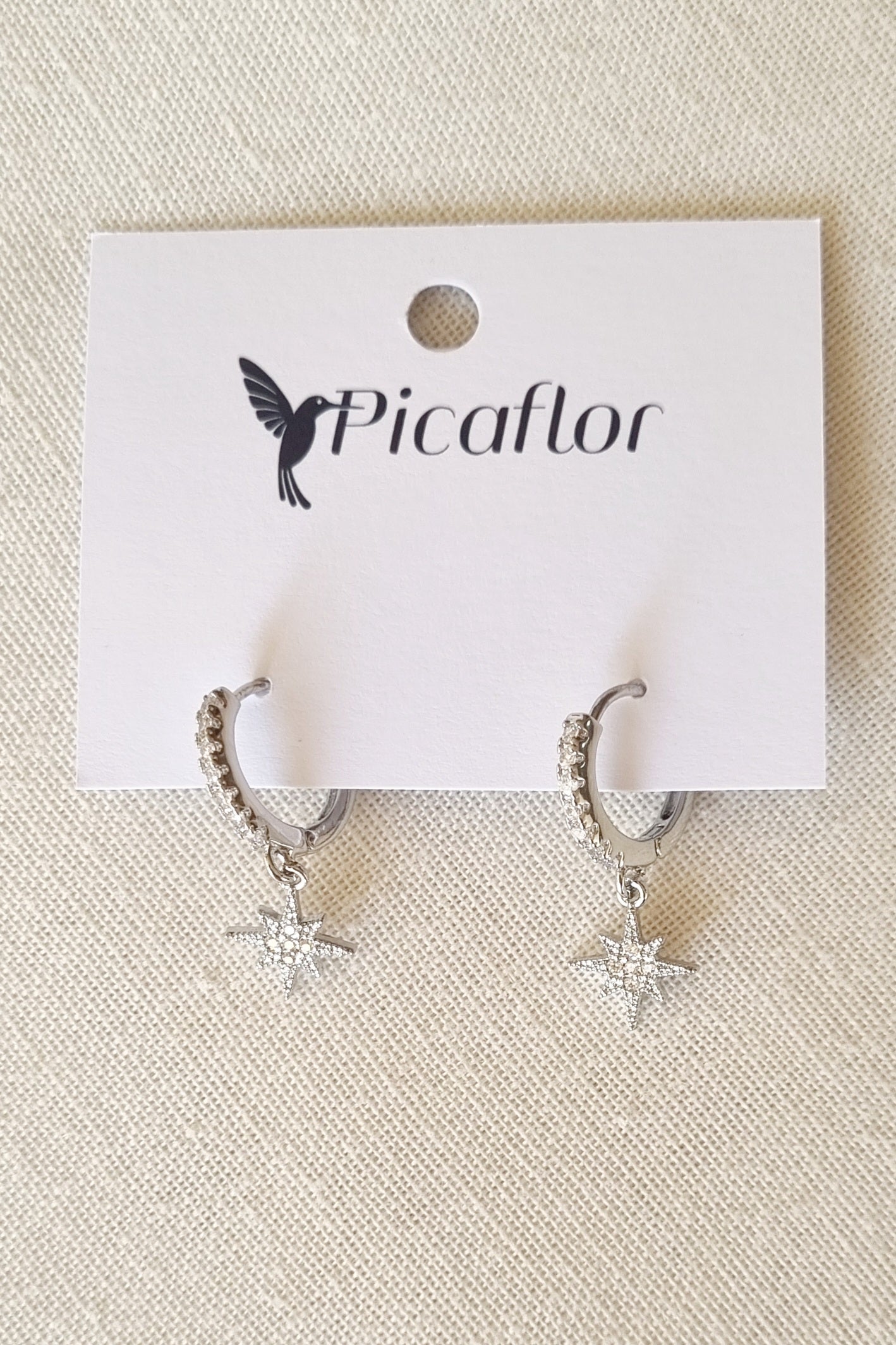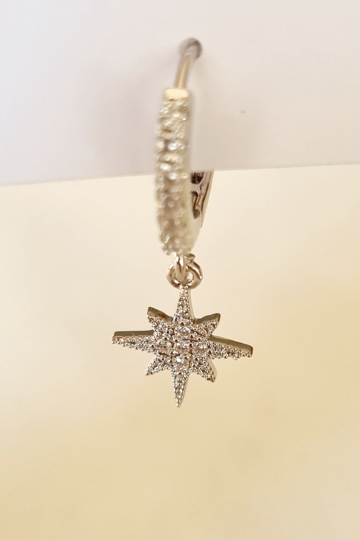 Aro pequeño con colgante de estrella de 8 puntas y diamantes de imitacion. Medidas 2,7cm x 1cm