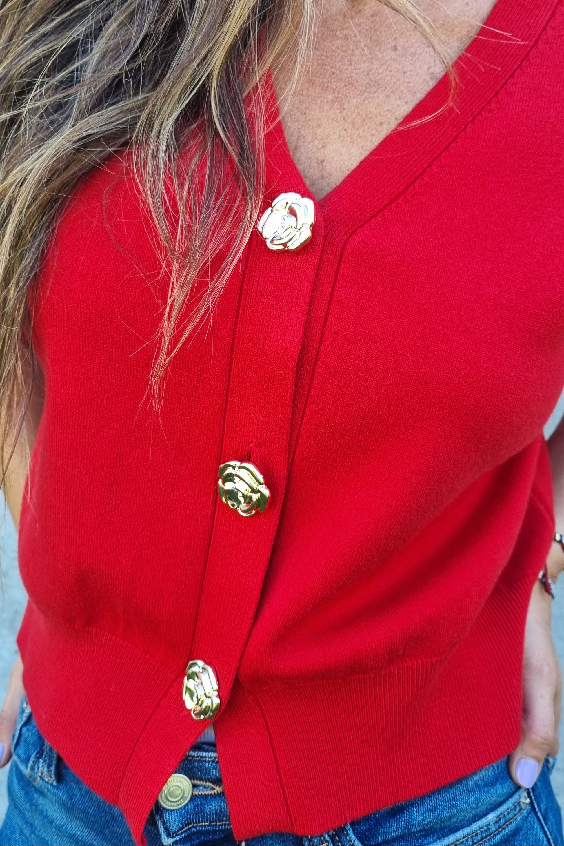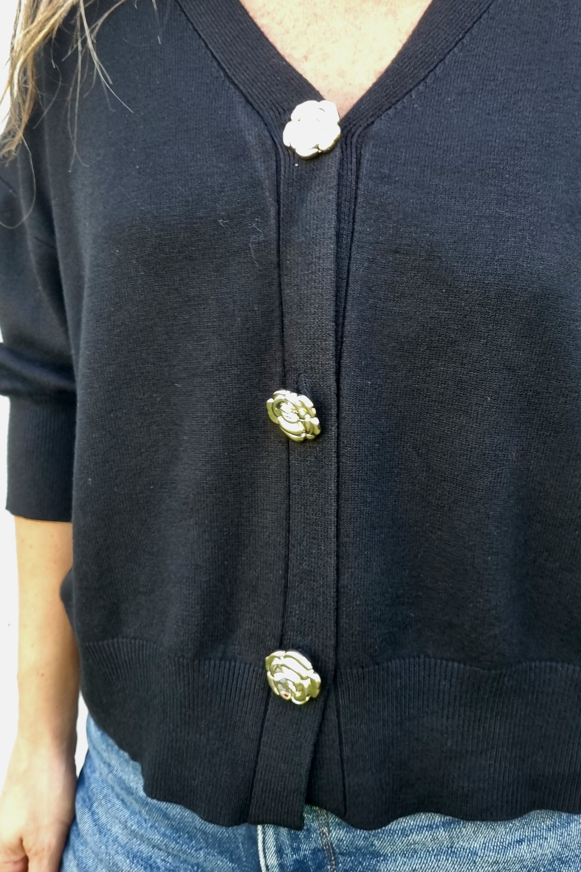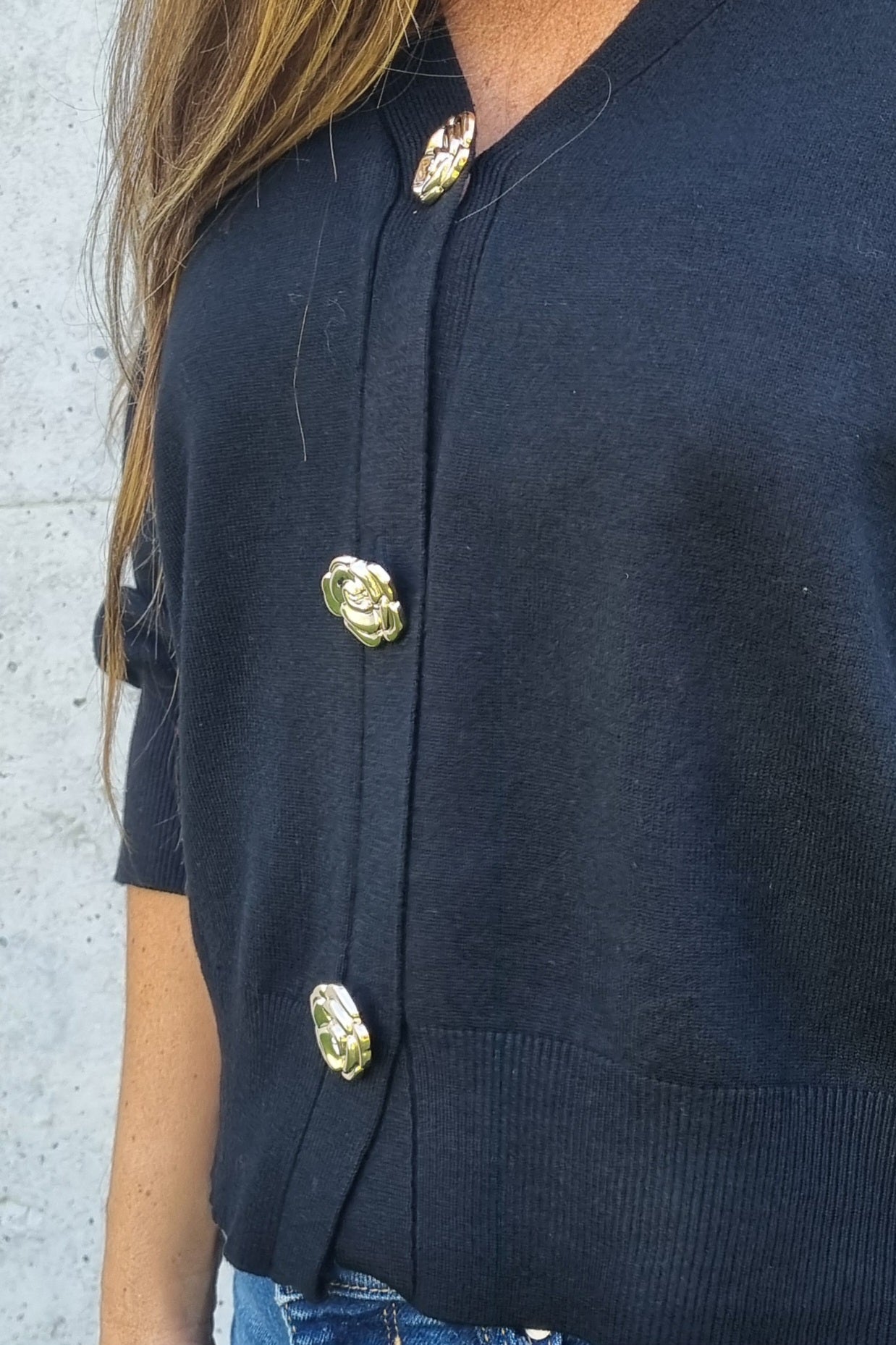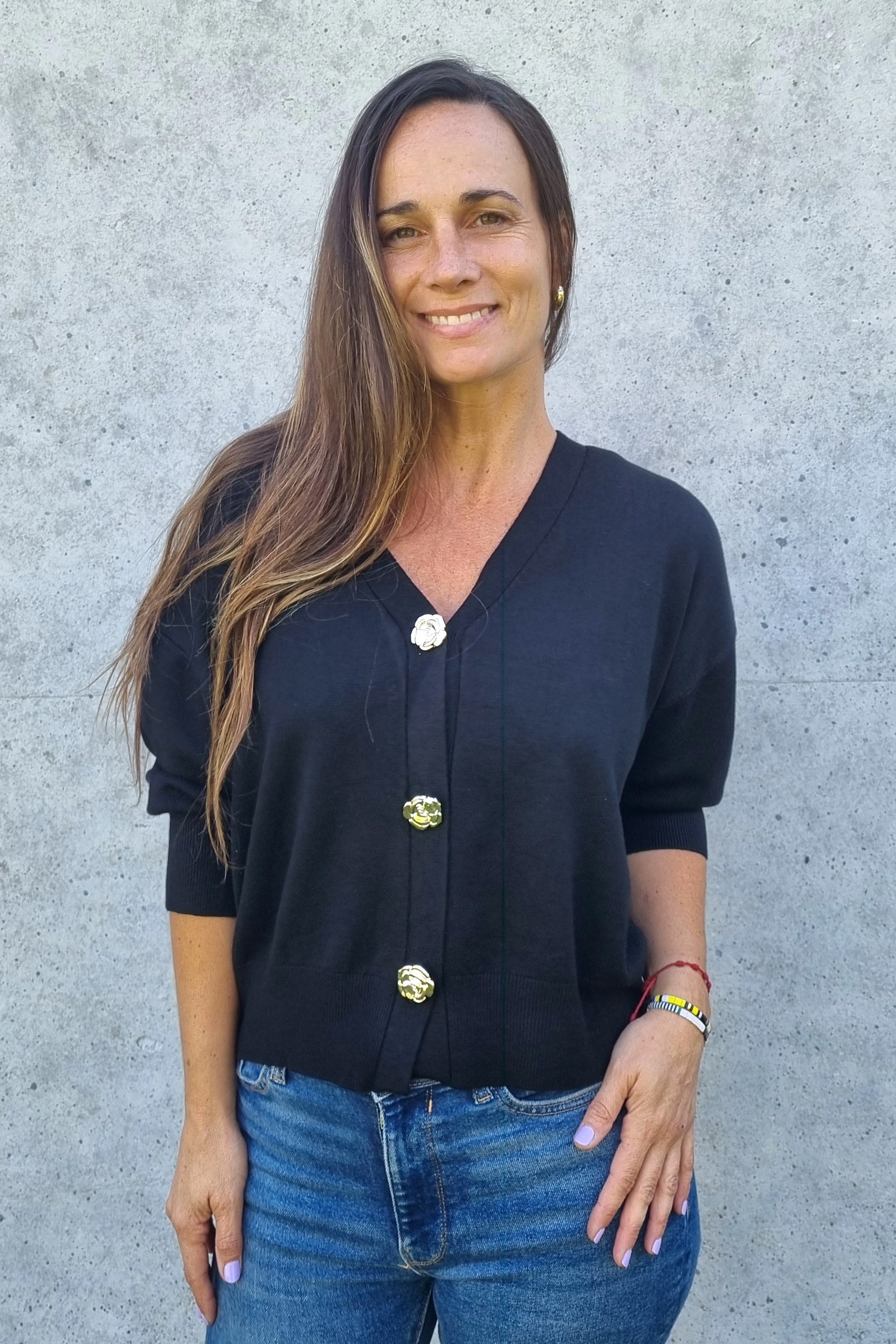 Chaleco versátil de hilo con manga corta que combina estilo y comodidad. Destaca por sus botones centrales con forma de rosas en dorado, un detalle elegante que lo diferencia. La tela suave y elasticada se adapta perfectamente al cuerpo, permitiendo libertad de movimiento. Perfecto para transitar entre la oficina y el día a día sin sacrificar sofisticación.