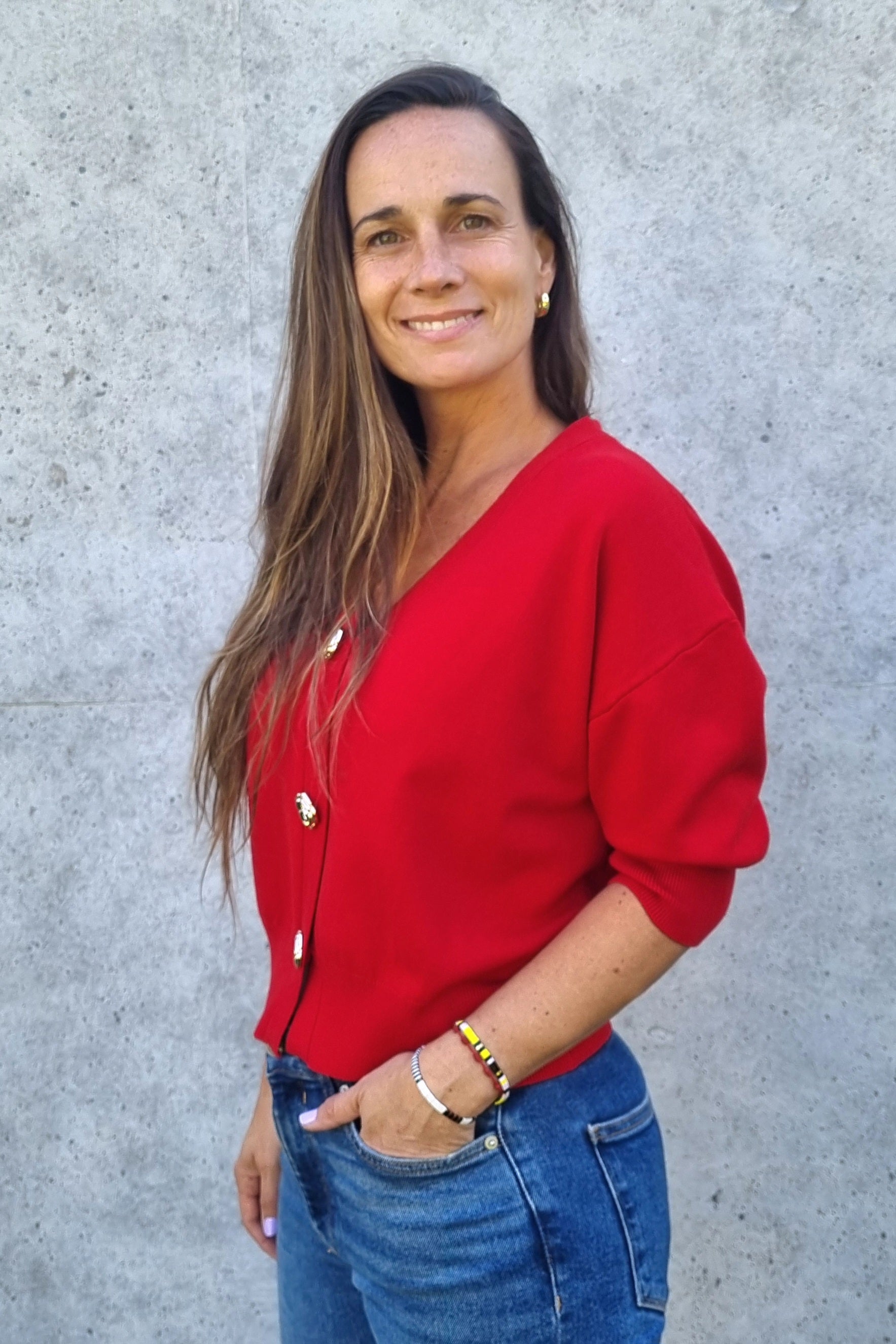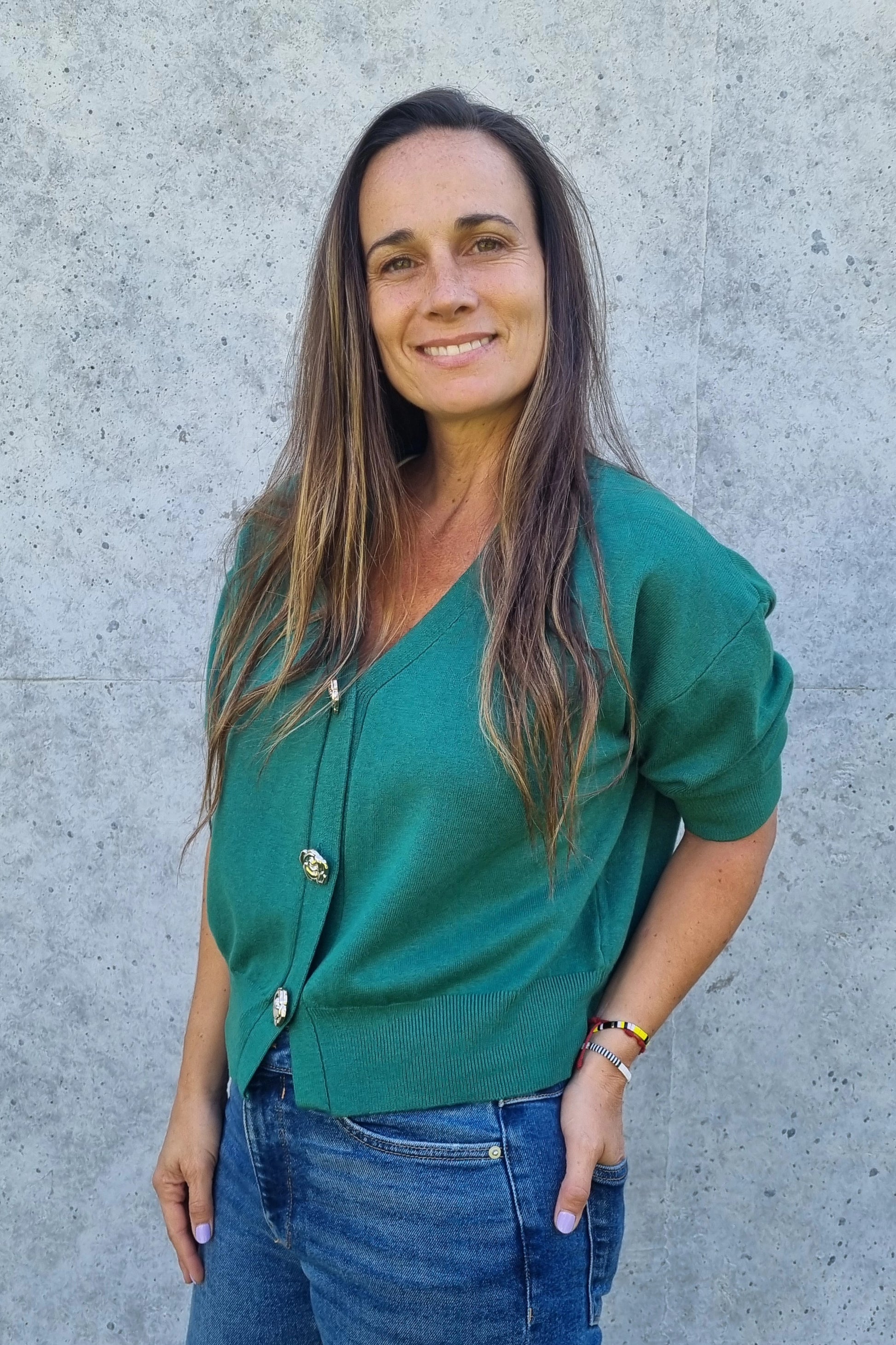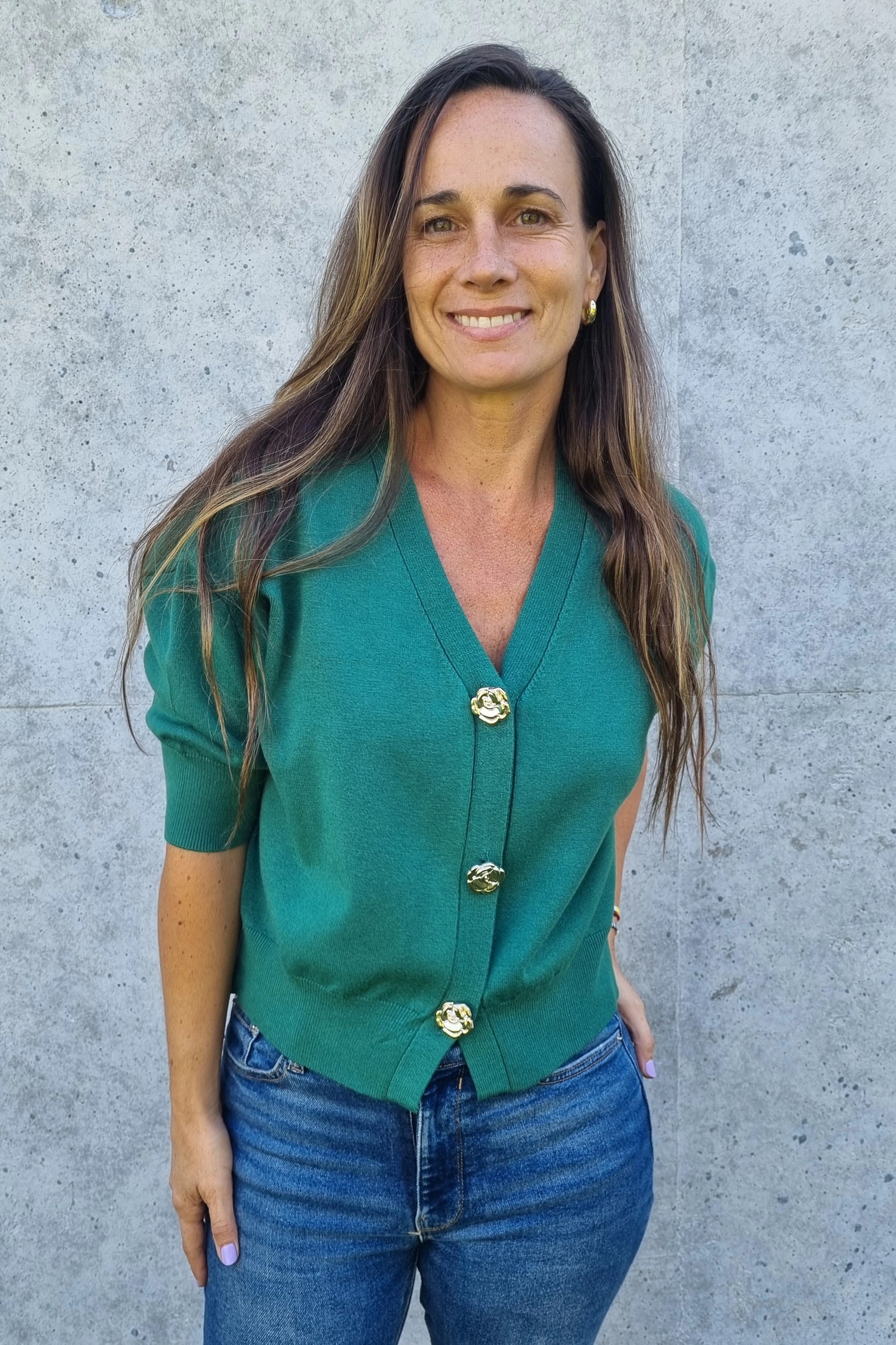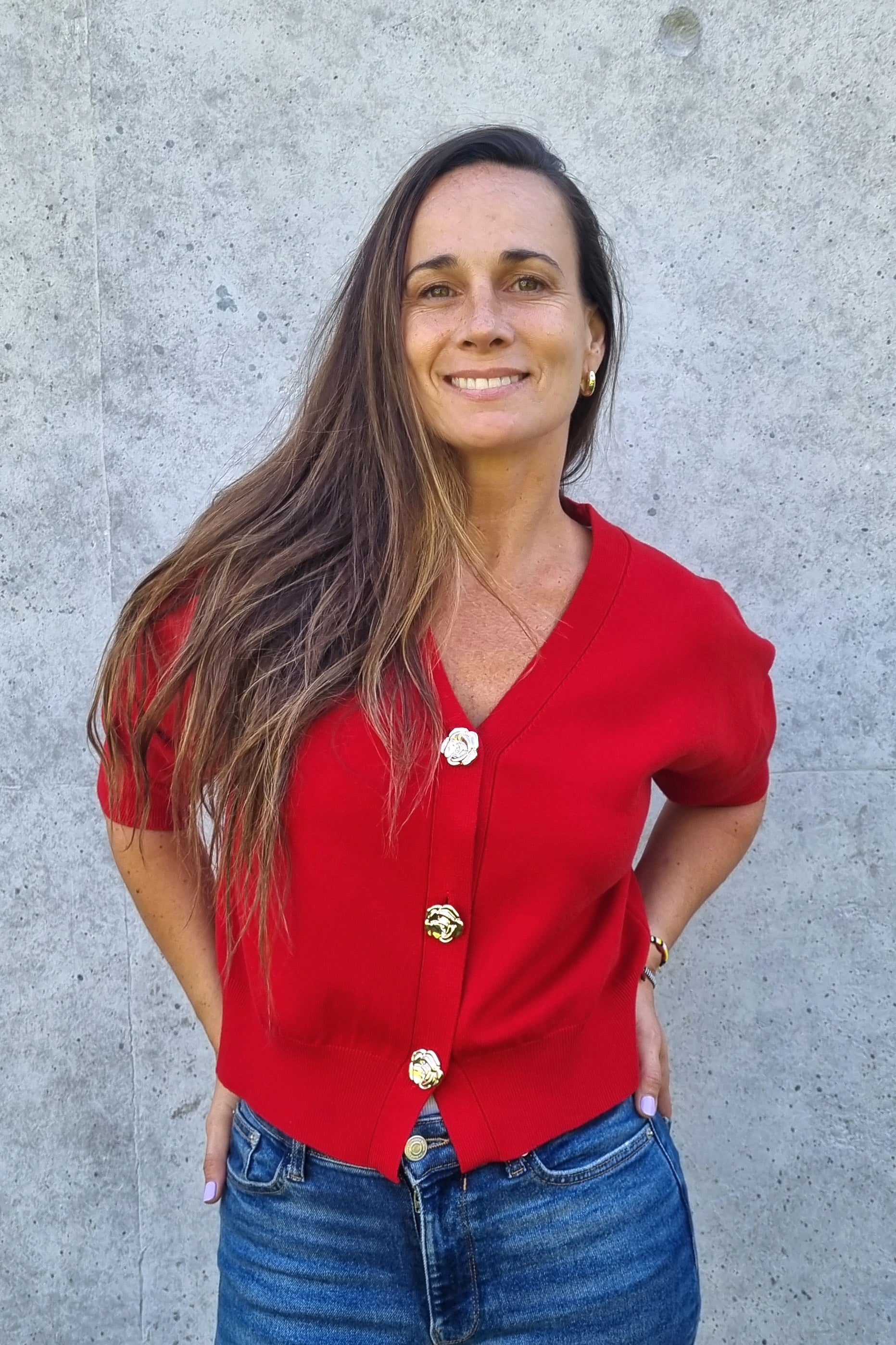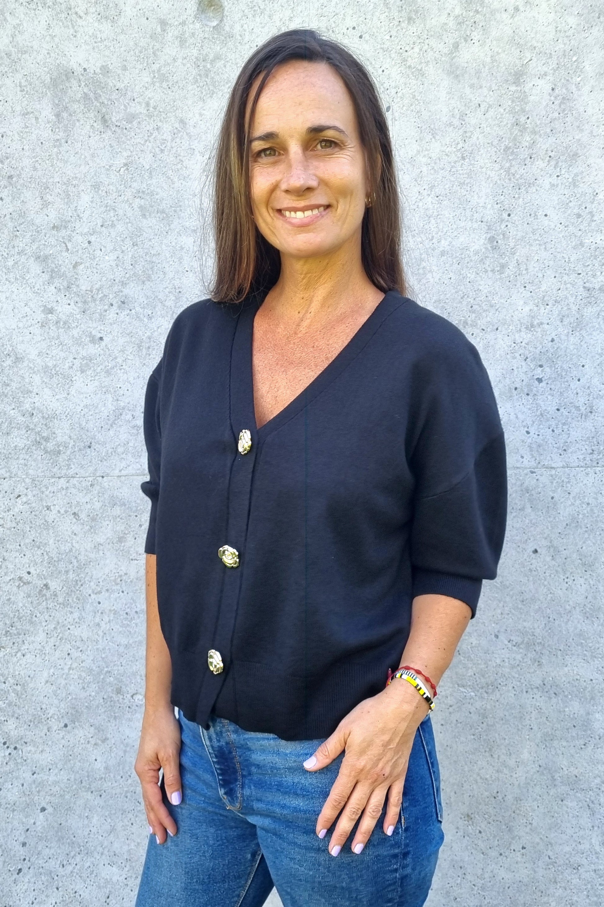 Chaleco versátil de hilo con manga corta que combina estilo y comodidad. Destaca por sus botones centrales con forma de rosas en dorado, un detalle elegante que lo diferencia. La tela suave y elasticada se adapta perfectamente al cuerpo, permitiendo libertad de movimiento. Perfecto para transitar entre la oficina y el día a día sin sacrificar sofisticación.