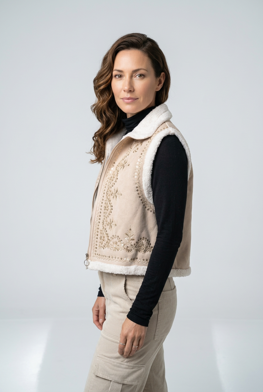 Chaqueta jose beige, sin mangas, chiporro por dentro y decoración con lentejuela por fuera, tela gamuzada