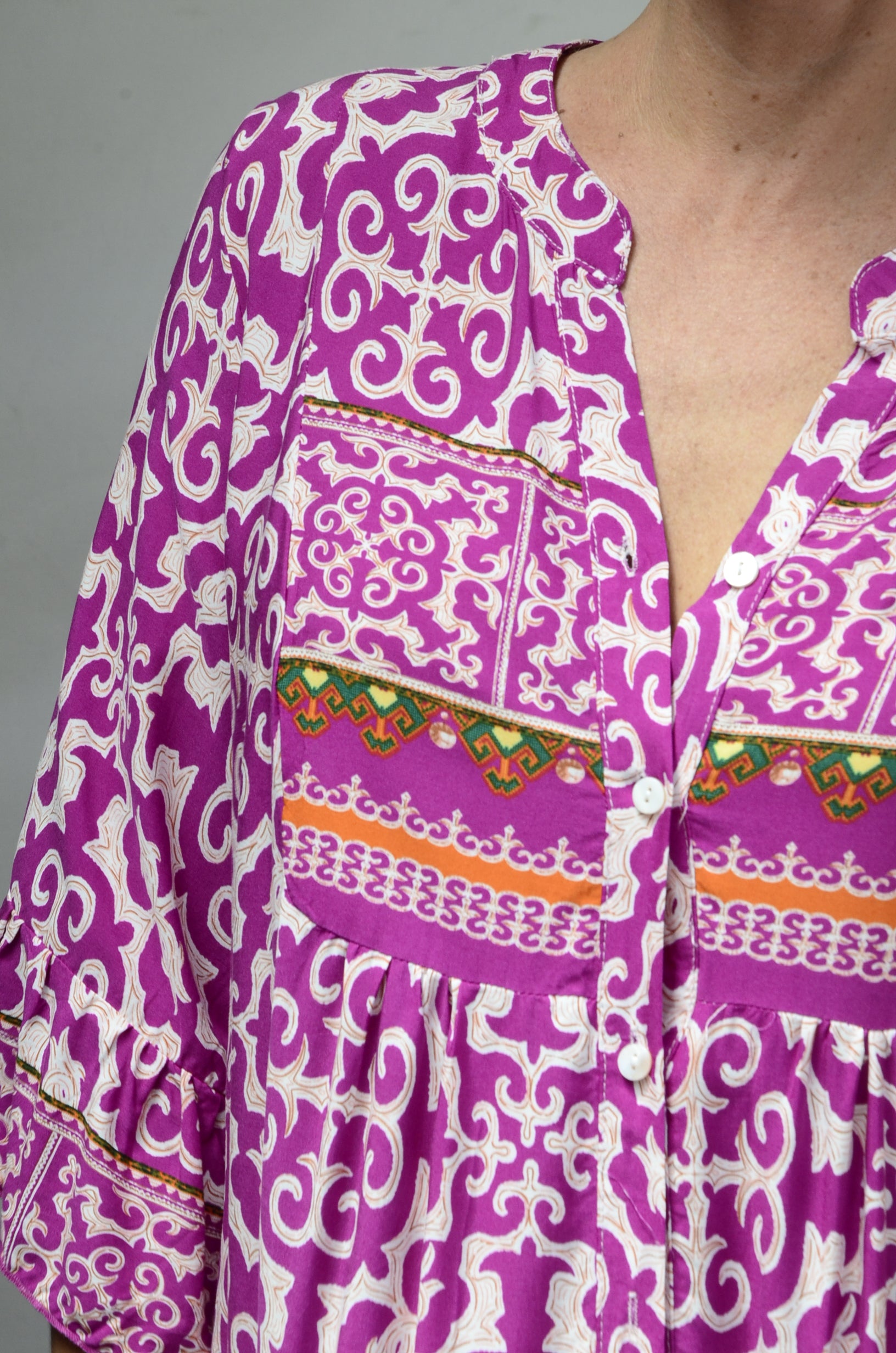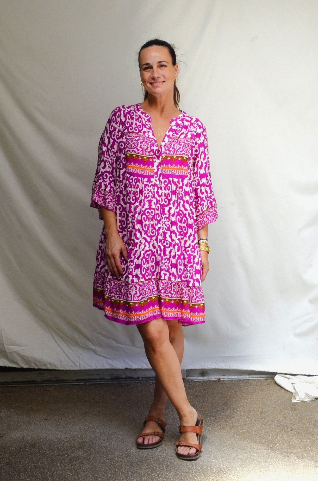 Este vestido sobre la rodilla y mangas 3/4 es muy liviano, ideal para los días de mucho calor.