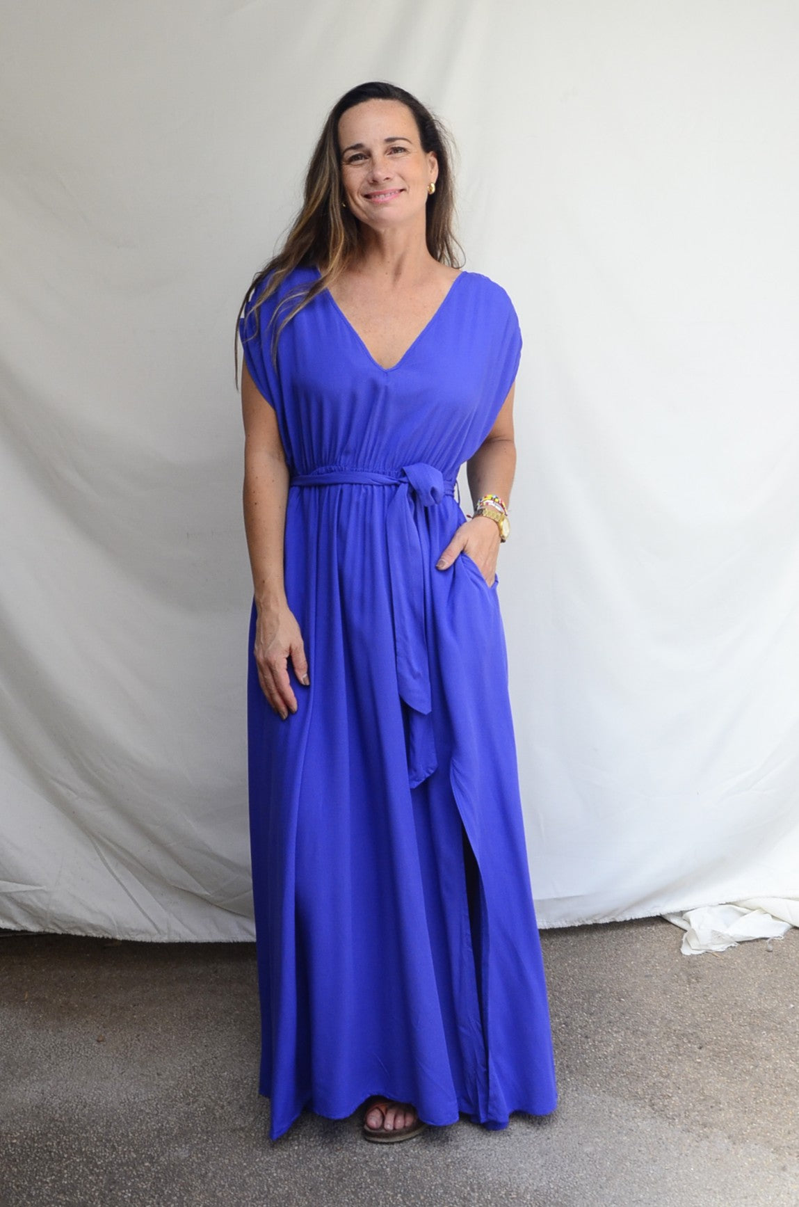 Un vestido largo con lazo a la cintura, un tajo frontal y manga arrepolladla en el hombro.