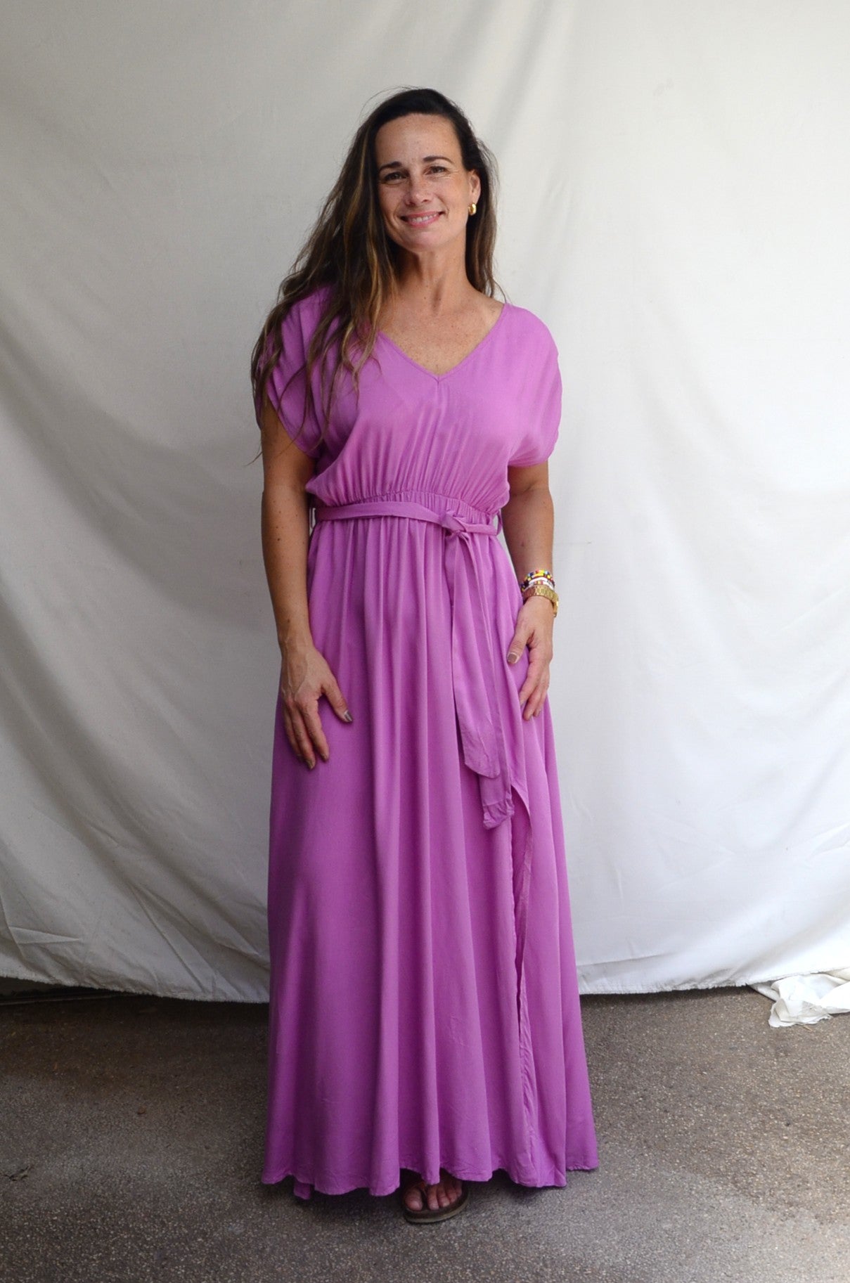 Un vestido largo con lazo a la cintura, un tajo frontal y manga arrepolladla en el hombro.