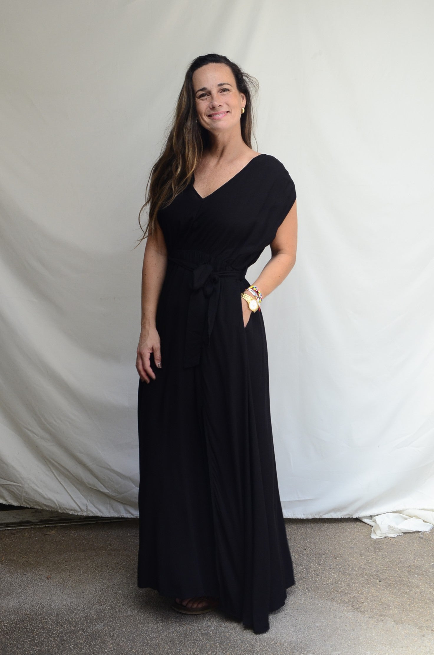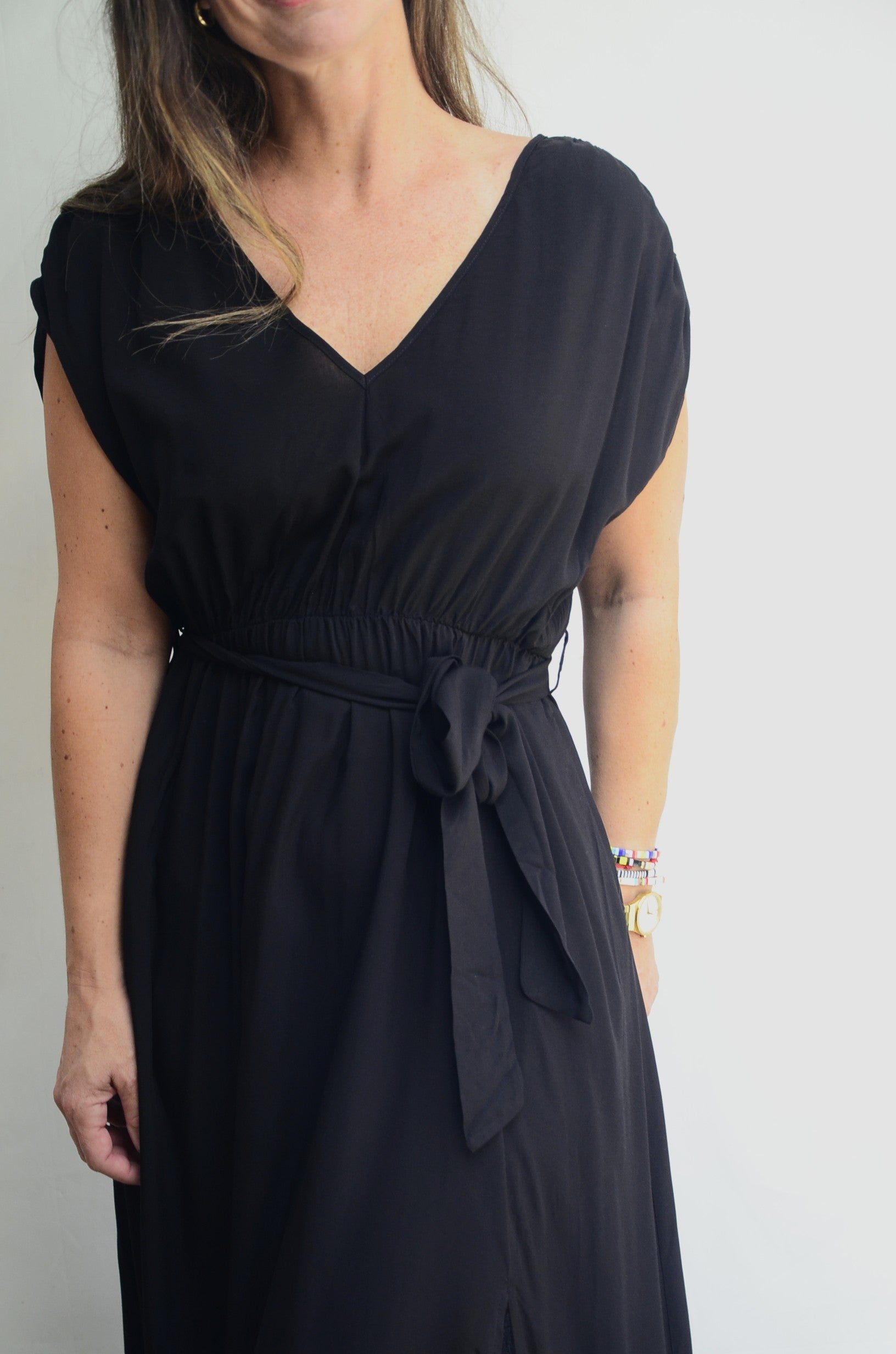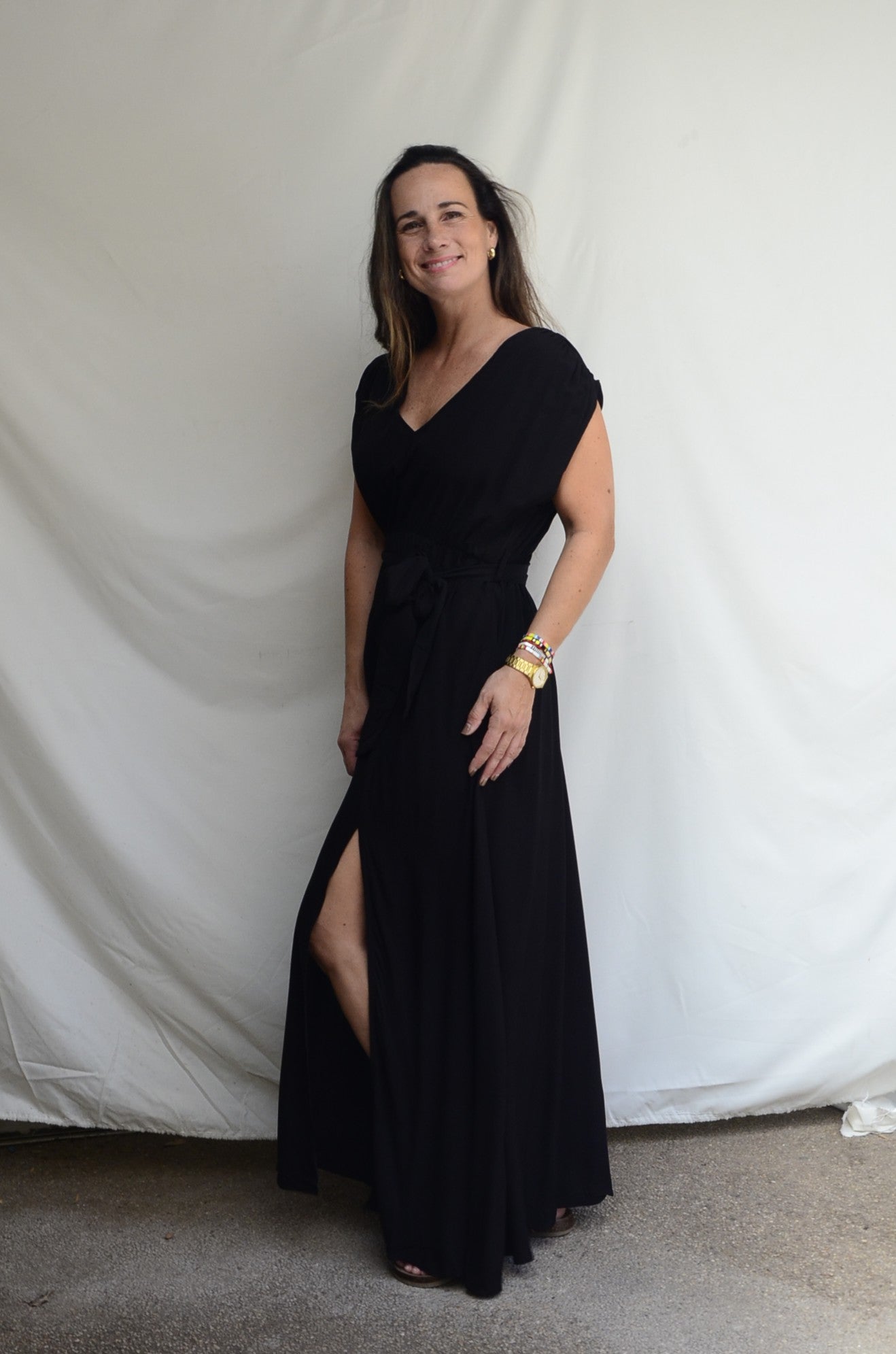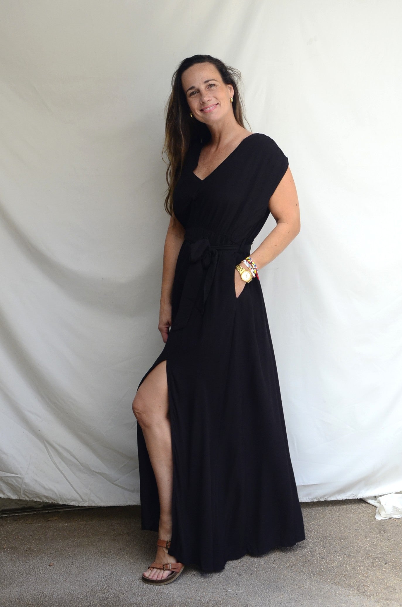 Un vestido largo con lazo a la cintura, un tajo frontal y manga arrepolladla en el hombro.