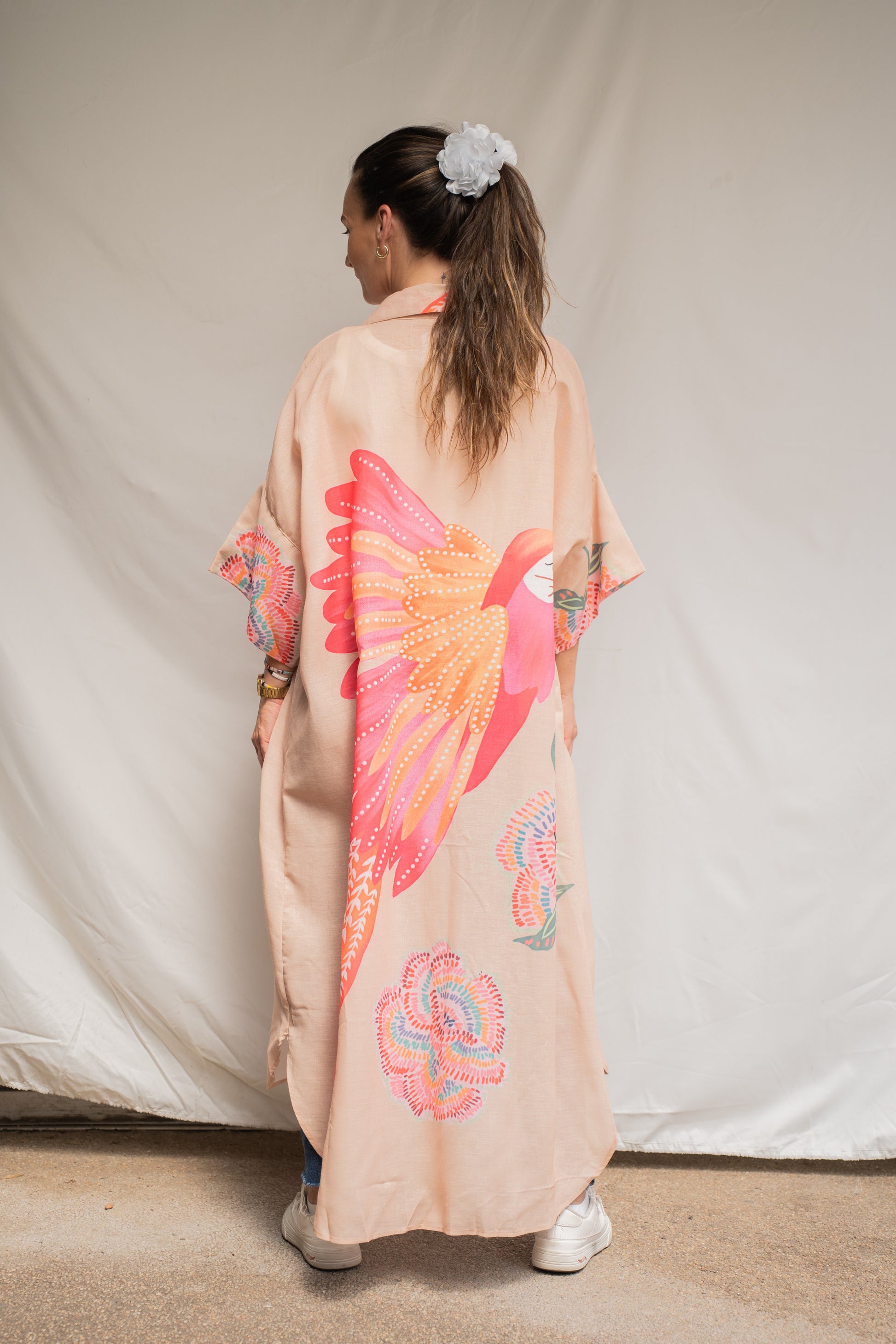 Ya sea como tapado o vestido camisero, este estampado de tucanes te hará lucir espectacular.